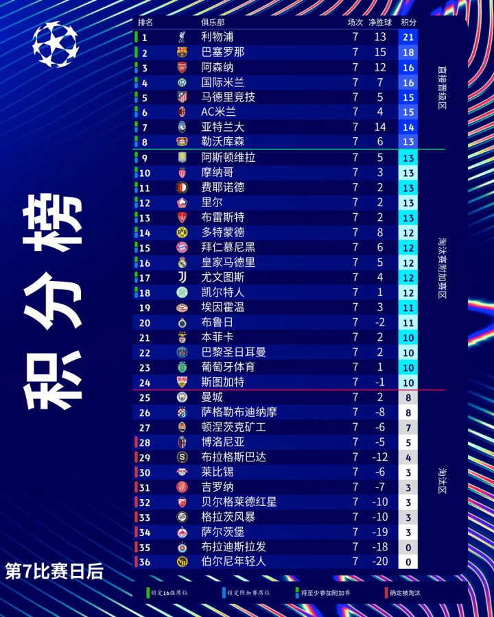 目前积分榜上,排名前8的球队除利物浦和巴萨直接晋级之外,阿森纳、国际米兰、马竞、AC米兰、亚特兰大和勒沃库森的身为领先,不过皇马、拜仁、尤文等豪门仍然保留着排名前八的机会。最危险的球队当属曼城,在2-4被巴黎逆转之后,曼城目前7轮8分排名第25位。